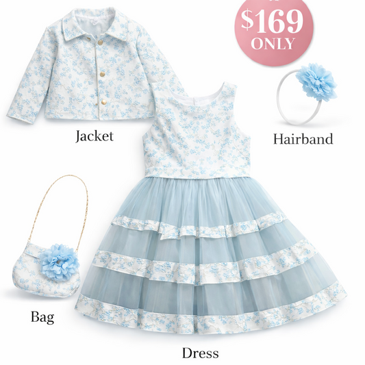 Luxury 4-Piece Girls Floral Wing Sleeve Tulle Dress Set – Includes Jacket, Bag & Headband