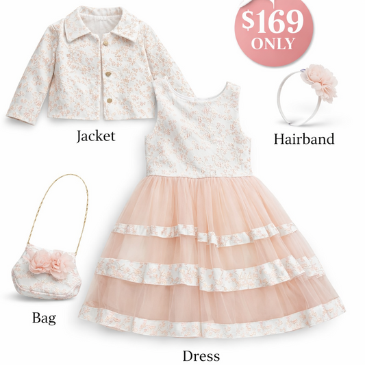 Luxury 4-Piece Blush Floral Jacquard Dress Set with Matching Jacket, Bag & Hairband
